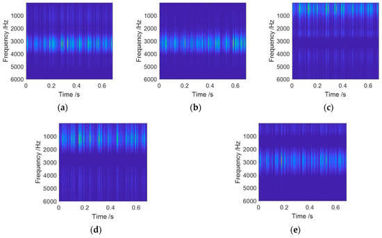 As the frequency componet and the time component share one-to-one correspondence, five TFDs were reconstructed via , as shown in Figure 15. It is worth mentioning that a single component within a factor might share interactions with other components. By “one-to-one correspondence,” we presume that the frequency component is characterized by time component and that the most dominant feature can be indicated by the frequency distribution of .