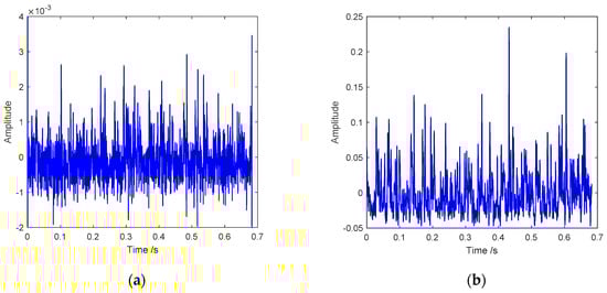 Specifically, the test signals were recorded during 12 February and 19 February 2004, when a failure occurred after over 100 million cycles causing a crack in the outer race of bearing 1. With the purpose of extracting the impulse feature in the signals at the stage of incipient faults, we examined the record for the 1st channel at 03: 42, 16 February 2004 (74 h before the end of the experiment), as shown in Figure 5.
