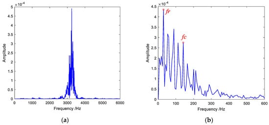 In Figure 16c we clearly see that the envelope spectrum extracts some major components, including the runing speed fr, the characteristic frequency fc (143.6 Hz) and the harmonics of fc. Specifically, the periodic impulses relating to the inner ring damage are accompanied with an intrinsic oscillation dominated by the resonance frequency at around 3200 Hz.