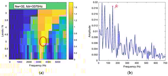 In the MSK model, the central frequency appears at 3375 Hz, level five, with a maximum kurtosis as presented in Figure 19a, and the frequency bandwidth is thereby obtained at 750 Hz. Thus, the signal within the band of from 2526 Hz to 4125 Hz is filtered and selected for envelope demodulation. From the envelope spectrum in Figure 19b, we can see that multiple peaks stand out, including the characteristic frequency of inner ring fault, fc. As this impulse component is affected by a few other insignicant components, we hold that the MSK method is also less effective in this case.