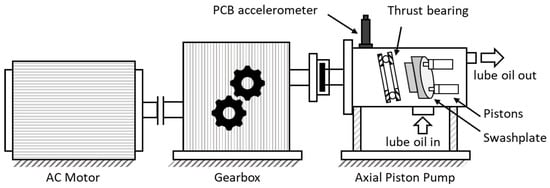 The schematic of our experimental test rig is presented in Figure 20, which is constructed with an AC motor, shaft couplings, a gearbox, and an axial piston pump. The pump is driven by the motor with a speed-increasing gearbox. Typically, the thrust ball bearing and the swashplate are designed for the reciprocating motion of the pistons, which increases the output pressure.