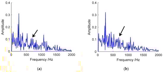The envelope spectrum in Figure 24b extracts the frequency of 687.5 Hz, which is consistent with the theoretical fault frequency of the thrust bearing. For comparison, the envelope spectra of the reconstructed TFD 1 and TFD 3, are presented in Figure 25. They do contain the fault frequency component, but they are apparently less observable than the spectrum in Figure 24.