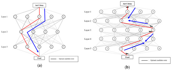 Conceptual comparisons between ACO algorithm and MPACO algorithm: (a) Optimal route search in ACO algorithm; (b) Optimal route search in MPACO algorithm.