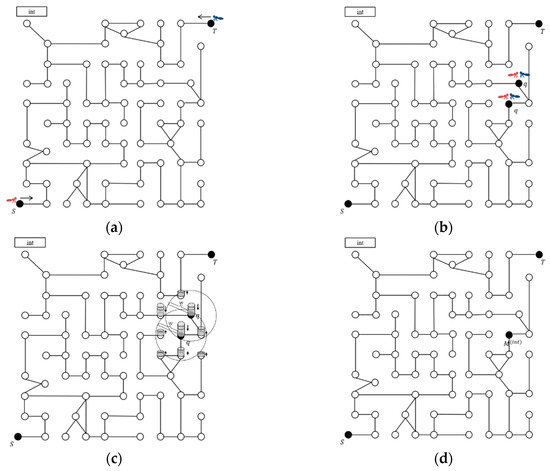 Figure 3a depicts the initial situation of the MPACO algorithm. The agents of each group start at the start point and the terminal point as usual, not just the start point of the maze. If the number of groups (randomly selected starting points) is , each group is composed of agents, where is the number of overall agents. When the agents from different groups often occur together with each other in a node, this node is defined as a collision node (). The existence of the collision node implies that the node may have a higher probability to be used as one of the paths. For this reason, when the collision node is detected, the pheromone is diffused and calculated.