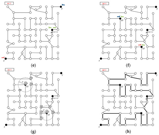 After updating the pheromone, a new node (Equation (19)) with the highest pheromone in the network is selected. The node selected is called an intermediate node (), as shown in Figure 3d. The reasoned node is added as a new starting node of the agents, as shown in Figure 3e, and additional collision nodes (Figure 3f) are detected in the following iteration. Then, the GPR-type pheromone is updated at the additional nodes, as shown in Figure 3g, using Equation (18). Finally, the strongest pheromone points are linked with each other, and determine a final effective route, as shown in Figure 3h.