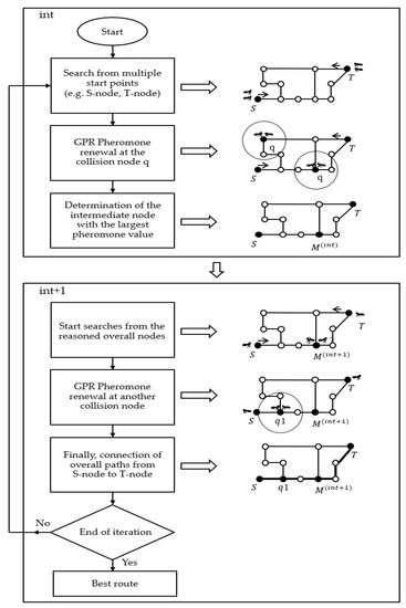 Figure 4 depicts a flowchart of MPACO algorithm that produces an optimal candidate route. As shown in Figure 4, two collision nodes are detected in the initial searches. Then, the intermediate node is reasoned using the GPR rule. The node is registered to starting node lists. Then, the final route is completed using the same iterations.