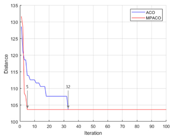Figure 9 illustrates the change of the cost function value in each iteration using ACO and MPACO, where the x axis indicates the number of iterations, and the y axis the route distance from the start node to the terminal node.