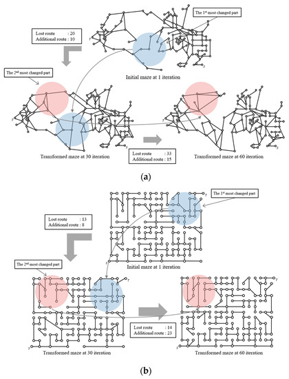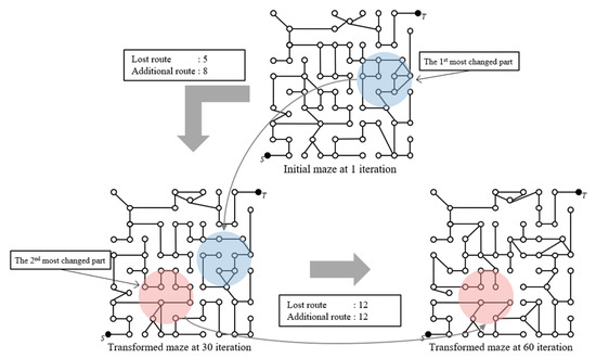 For the comparison with the previous methods used, the route topology of the maze is set to change after every (30 and 60) iterations to describe a network with a dynamic topology change. and in Equation (20) are modeled in this experiment with (1.4 and 5), respectively. As shown in Figure 10, a network has two topological changes during the learning processes.