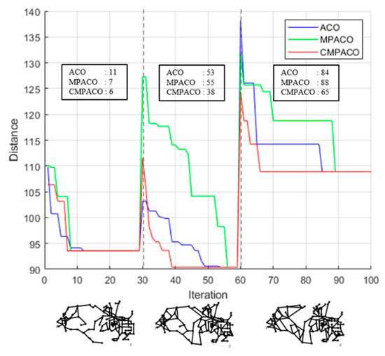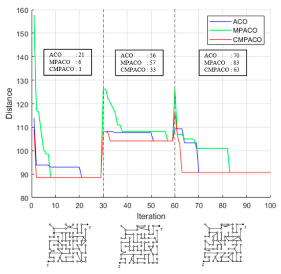 In order to verify the validity of the proposed CMPACO algorithm, numerical experiments are conducted on the dynamic changes of network topology, where during the learning process, a portion of the network changes. As shown in the previous section, the topology of the network often changes due to the sudden congestion that in real applications is often caused by road construction. The tests with CMPACO are analyzed and compared with tests with the ACO algorithm and MPACO algorithm. The test conditions and assumptions follow the descriptions in Table 6 and Table 7 of Section 5.1.