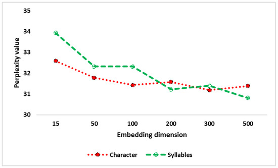 Further, we investigated the effect of different character and syllable embedding dimensions on the perplexity values. Figure 3 shows that there is no statistically significant effect of the dimension on perplexity values. However, the most appropriate embedding dimensions for our experiment could have been 200 or 500 for both characters and syllables; we used a dimension of 200.