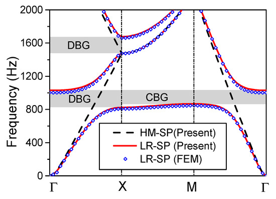 Dispersion curves of a locally resonant sandwich plate (LR-SP) and a homogeneous sandwich plate (HM-SP). (DBG—directional band-gap; CBG—complete band-gap.).