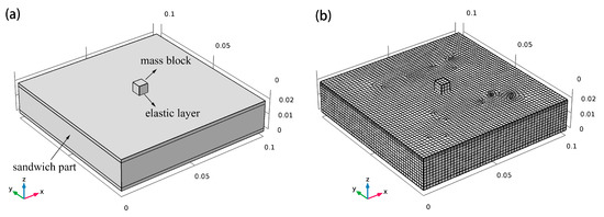 The theoretical formulations are validated using a finite-element-method (FEM) numerical model based on the COMSOL Multiphysics software. Shown in Figure 4a is a unit element, which mainly consists of the bottom sandwich part and the top mass-block part. The dimensions and material properties of the sandwich part are the same as that shown in the beginning of Section 3, except that the density of the core is modified to be 102.2 kg/m3 as the core layer is considered as homogeneous in the FEM model. The mass of the top mass-block part is set to be 0.0315 kg and its Young’s modulus is set to be as large as 1 × 1015 Pa so that the block could be considered as a rigid body. A connection function called “elastic layer” in COMSOL is added in the FEM modal between the bottom sandwich part and the top mass-block part, so that the two parts are elastically connected. The spring stiffness of the “elastic layer” is set to be , which is the same as that described in the beginning of Section 3. The meshing model is shown in Figure 4b with the element size set as small as 2 mm for the purpose of satisfying the adequate meshing resolution at the highest frequency 2000 Hz.