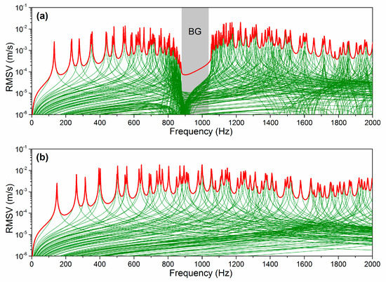 Root-mean-square velocity (RMSV) averaged over the plate surface and corresponding modal contributions in (a) a locally resonant sandwich plate and (b) a homogenous sandwich plate. (BG—band-gap.)