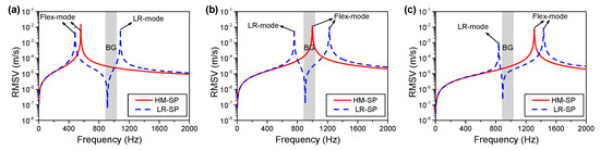 Comparison of modal contributions for a homogeneous sandwich plate (HM-SP) and a locally resonant sandwich plate (LR-SP) for (a) mode (2, 3), (b) mode (5, 4), and (c) mode (5, 6). (Flex-mode—flexural vibration mode; LR-mode—resonator vibration mode.).