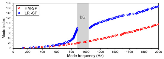 Further observation of Figure 5 and Figure 6 shows that these two modal frequencies in the LR sandwich plate are always set apart by the band-gap, with one mode positioned at the left side and the other at the right side, and that no mode exists in the band-gap. This phenomenon is also revealed through modal analysis of an LR sandwich plate and a homogeneous sandwich plate, and their modal frequencies are shown in Figure 7. For the homogeneous sandwich plate, the modes may be positioned at any frequency based on the dimensions and boundary conditions of the finite structure. However, for a homogenous sandwich plate, when resonators are introduced the modal frequencies positioned within the band-gap are shifted to the left side or right side of the band-gap. As a result, vibration modes are not allowed in the band-gap of the LR sandwich plate. Thus, the vibration in the band-gap can be reduced.