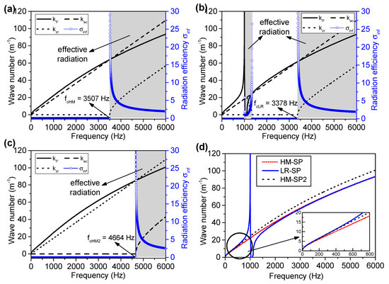 Shown in Figure 8a–c are the structural wave number , acoustic wave number , transverse acoustic wave number , and radiation efficiency of an infinite homogeneous sandwich plate (HM-SP) in Figure 8a, an infinite LR sandwich plate (LR-SP) with the resonator tuned at in Figure 8b, and an infinite homogeneous sandwich plate with the LR mass added to the core layer (HM-SP2) in Figure 8c. The difference between HM-SP and HM-SP2 is that the mass of resonator is added to the core layer in HM-SP2 in order to examine the effects of increase of weight due to periodic resonators on radiation properties, thus the weight of the structure of HM-SP2 keeps the same as that of the structure of LR-SP. It is well known that, in an infinite structure, sound radiates efficiently only in situations where the phase speed of a structural wave exceeds the speed of sound in the surrounding medium (). Thus, can be considered as an indicator of whether a wave with a specific frequency radiates efficiently or not, that is, a wave radiates efficiently when exceeds zero and inefficiently when equals zero. For a homogeneous structure, the frequency that satisfies is generally called the coincidence frequency, where vibration energy may transform to sound radiation power most efficiently and the corresponding radiation efficiency tends to infinity.