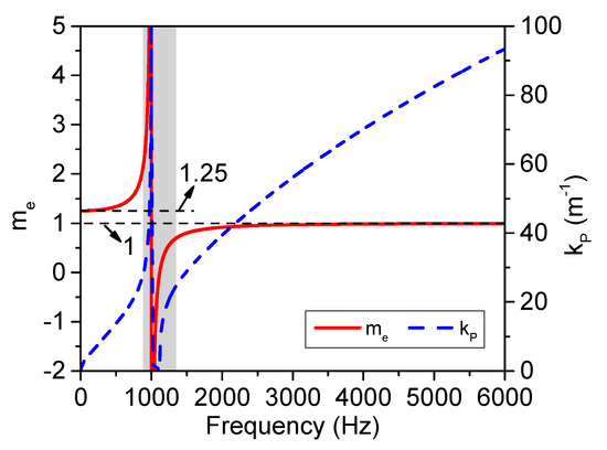 where is the mass of a unit element of the base sandwich plate. As shown in Figure 8, radiation efficiency is strongly dependent on the structural wave number , thus and are shown together in Figure 9 for further analysis. It is observed that, with the increase in frequency, increases from 1.25 to infinity over 0–1000 Hz, then increases from minus infinity to approximately unity (but always less than unity) between 1000 and 6000 Hz. In the lower frequencies, the limit of is 1.25, which is exactly the effective mass of the structure of HM-SP2. In the higher frequencies, tends to unity, which is exactly the effective mass of the structure of HM-SP. This phenomenon is the same as that observed in Figure 8b. It can also be observed that the effective mass is disconnected at 1000 Hz (the resonance frequency of the resonator). By comparing the two curves in Figure 9, it is found that varies synchronously with , and the position where reaches its maximum is also the position of the maximum of . This phenomenon can be simply comprehended by referring to a homogenous single-layer plate, whose structural wave number is proportional to the fourth-root of the material density, that is, . Thus, increases with increasing density/mass and decreases with decreasing density/mass.