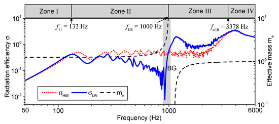 In zone I, is mainly contributed to from the first several modes, where the first mode makes the greatest contribution, as it has the greatest modal vibration velocity and also the greatest modal radiation efficiency below the fundamental frequency. Thus, both and can be approximately estimated from the radiation efficiency of the first mode, , which is the reason it is generally considered as monopole radiation. As shown in this expression, the radiation efficiency is not related to the parameter of mass, and thus the variation in effective mass has little effect on radiation efficiency in zone I. In zone IV, the radiation efficiency of a finite sandwich structure is approximately the same as that of an infinite sandwich structure. Thus, the radiation efficiencies of these two sandwich structures can be expressed as and . As is below unity above 1000 Hz, , which was analyzed in Sub-Section 3.3. Therefore, at most of the frequencies in zone IV, is slightly smaller than . Furthermore, with the increase in frequency, gradually becomes approximately equal to unity, resulting in the radiation efficiency of the LR sandwich plate being nearly the same as that of the homogeneous sandwich plate. In zone II and zone III, for corner-mode and edge-mode radiation, it can be inferred from Equation (25) in [50] that the material density has a negative effect on radiation efficiency. Thus, the increasing mass in zone II induces decreasing radiation efficiency, while the decreasing mass in zone III induces increasing radiation efficiency, especially near the resonance frequency of the resonator.