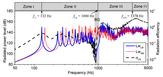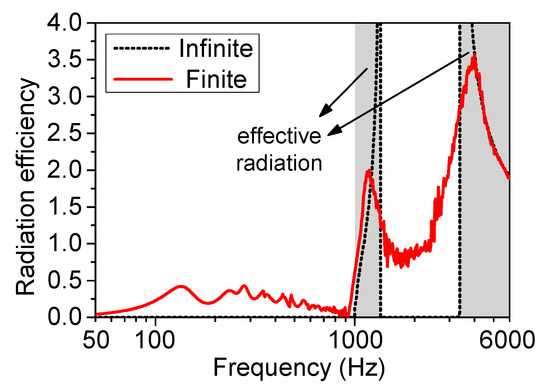 Shown in Figure 10 is a comparison of the radiation efficiencies of homogeneous () and LR () sandwich plates. It is noticed that the effects of the periodic resonators on radiation efficiency depend on frequency. In the figure, the whole frequency zone is divided into four parts: zone I (0 Hz−), zone II (−), zone III (−), and zone IV (−6000 Hz), where , , and are the fundamental frequency, the resonance frequency of the resonator, and the coincidence frequency of the LR sandwich plate, respectively. Below the fundamental frequency (zone I) and above the coincidence frequency (zone IV), the periodic resonators have little small effect on radiation efficiency and and are nearly the same, with slightly higher than in zone I and slightly lower in zone IV. Meanwhile, in zone II and zone III, and vary significantly and the periodic resonators have a negative effect on radiation efficiency in zone II and a positive effect in zone III. Thus, compared with the homogeneous sandwich plate, the radiation performance of the LR sandwich plate is improved in zone II yet deteriorated in zone III. It is also noticed that, at frequencies close above the band-gap in zone III, reaches a local maximum of 1.99 at 1158 Hz, which is more than five times that of . In the frequency band close to 1158 Hz, the LR sandwich plate radiates very efficiently. In fact, this frequency region is simply the resonator-induced effective radiation zone in an infinite LR sandwich plate, which can be found by comparing the radiation efficiency of finite and infinite LR sandwich plates, as shown in Figure 11, where the two shaded regions are the effective radiation zones in an infinite LR sandwich plate.
