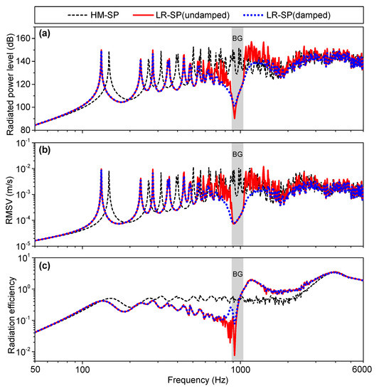 As the radiation efficiency is strongly related to the structural wave number , the structural wave numbers of HM-SP, LR-SP, and HM-SP2 are compared to further examine the radiation properties in Figure 8d. As shown in the figure, in the lower frequencies between 0 Hz to approximately 600 Hz, the structural wave number of LR-SP nearly coincidence with that of HM-SP2. It is noticed that these above two structures have the same weight, thus the increased weight introduced by periodic resonators have some effect on the radiation. In contrast to lower frequencies, in the higher frequencies between approximately 2.5 to 6 kHz, of LR-SP nearly coincides with that of HM-SP, inducing that the weight introduced by periodic resonators have little effect on the radiation properties in high frequencies.