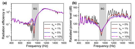 Generally speaking, the damping of the resonator broadens the attenuation zone of sound radiation, especially when the sound radiation above the band-gap is also reduced. In much of the attenuation zone, radiation suppression caused by damping of the resonator is mainly due to the effect of damping on the vibration response instead of the radiation efficiency, which can be inferred by checking Figure 14b,c. For the radiation efficiency in Figure 14c, when is set to the small value of 0.05, the damping of the resonator only has an observable effect on the radiation efficiency in the frequency range from 745 to 917 Hz, which is located within or below the band-gap. In this frequency band, the damping of the resonator helps to increase the radiation efficiency, which in turn causes increased radiation over 889–917 Hz. As shown in Figure 15a, with the increase in damping, the radiation efficiency is noticeably increased in the frequency band from 745 to 917 Hz, and is decreased near the frequency of 1130 Hz. However, this decrement is very small, and this will not noticeably affect radiation power.