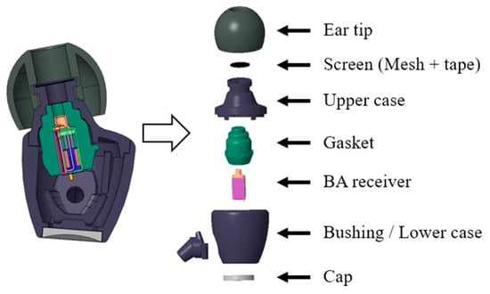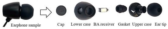 Two dominant types of commercial receiver designs exist for translating electrical signals into acoustic signals: dynamic receivers (also known as moving-coil receivers) [1,2,3] and balanced armature (BA) receivers [4,5]. Products with BA receivers are becoming increasingly popular because of their small size and high sound quality. On account of these advantages, BA receivers have been extensively employed in stethoscopes, hearing aids, earphones, and smartwatches. Therefore, several kinds of research have been done involving analyses of the electromagnetic and acoustic characteristics of BA receivers using the lumped parameter method [6] to set up the equivalent circuit, and finite element method [7] to divide the BA receiver into finite elements. However, no research exists regarding the reliability of BA receiver application. With the increasing demand for high sound quality, an increased number of BA receivers are being used in earphones, which are a popular product. Nonetheless, it is inevitable that earphones are frequently struck by external forces, especially when dropped from a certain height. Compared to dynamic receiver earphones, BA-receiver earphones are more prone to failure because of their smaller size; a gasket is used to protect the BA receiver, but the original gasket (OG) is not sufficient at preventing the BA receiver from being destroyed. Therefore, this article focuses on improving the reliability of BA receiver earphones by designing a novel concept gasket (NCG).