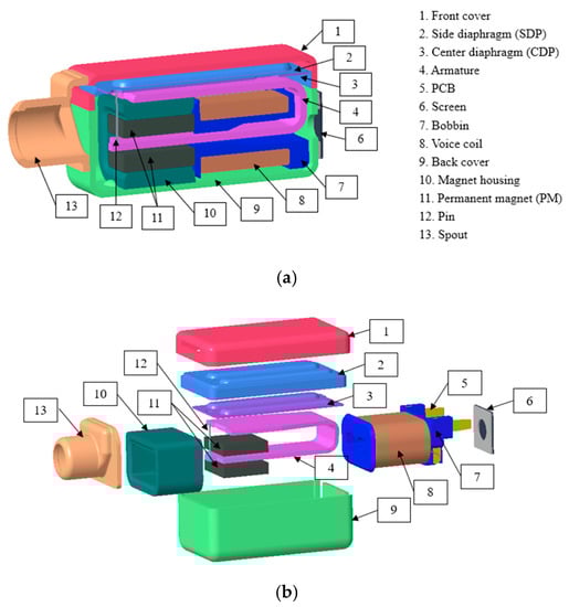 - Xu, D.P.; Lu, H.W.; Jiang, Y.W.; Kim, H.K.; Kwon, J.H.; Hwang, S.M. Analysis of sound pressure level of a balanced armature receiver considering coupling effects. IEEE Access 2017, 5, 8930–8939. [Google Scholar] [CrossRef]