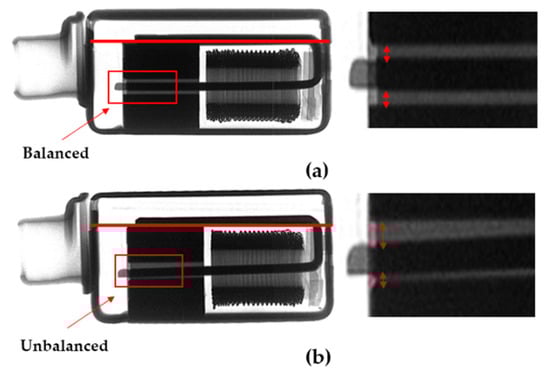 X-ray photography was selected to check the integrity of the internal structure of the BA receiver, and the critical point of the X-ray photo was checked in whether the armature kept balance or not. The X-ray photos of these four BA receivers are presented in Figure 21. By comparing them, the armatures of No. 1 and No. 2 were seen to be unbalanced, while those of No. 3 and No. 4 were balanced after the drop impact test. The upper air gap of No. 1 and No. 2 were longer than the lower air gap, which could cause the asymmetry of the magnetic flux without a current and could lead to higher sound harmonic distortion. From these results, the novel concept gasket was proven to better protect the BA receiver. However, to confirm the proper working condition of the BA receiver, the SPL and THD must be measured.