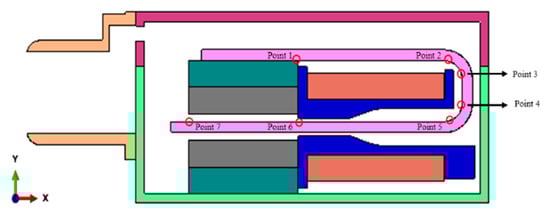 Some parts of the BA receiver were removed, such as the SDP, the CDP, and the drive pin, as they have no significant effect regarding the drop impact analysis. The first step was to determine the drop direction that causes the maximum von Mises stress on the armature; seven points of the armature were set, and five drop directions established to complete the analysis and compare the results. All points, from 1 to 7, were central points of the armature, as shown in Figure 5.