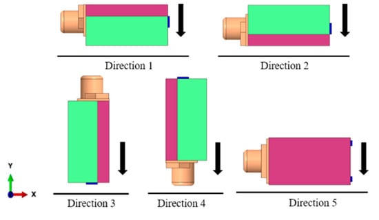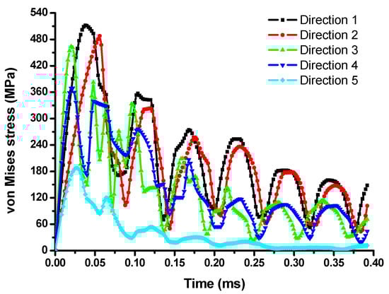 By comparing the analysis results, direction 1 always had the maximum von Mises stress value, followed by direction 2, while direction 5 had the minimum, as directions 1 and 2 were perpendicular to the direction of armature vibration, as shown in Figure 7.