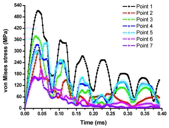 The von Mises stress on the seven points of the armature in direction 1 showed that point 1 had the maximum value, as it was located closest to the connection part between the armature and the magnet housing fixed on the back cover, as shown in Figure 8. Therefore, direction 1 was set as the reference drop direction and point 1 as the reference point.