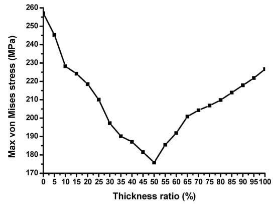 Setting the gasket with LAR as the example, the other regions were all solid. The thickness ratio of LR was equal to LAR’s thickness over LR’s thickness, which was the sum of the thickness of LAR and LSR. Others were found to be in the same way. The influence of the thickness ratio of LR on the maximum von Mises stress is shown in Figure 12. The change tendency of the maximum von Mises stress did not decrease linearly with the increase of the thickness ratio—the volume of LAR increased, leading to the provision of more internal pressure, whilst at this time the solid region was still sufficient in absorbing shock. After reaching the critical ratio, the solid region was not enough for absorbing shock, which caused the maximum von Mises stress to increase. When the thickness ratio was 100%, the air regions connected to the outside, and there was no longer any internal pressure for shock. According to the analysis results, when the thickness ratio was 50%, the solid region and the air region had a good balance on absorbing shock. Furthermore, applying the same thickness ratio to the other regions caused the novel concept gasket to come out.
