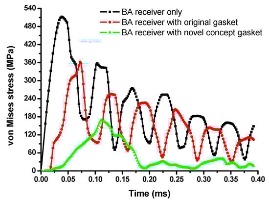 The results of the von Mises stress of the BA receiver without the gasket and the BA receivers with different gasket types are shown in Figure 14. By comparing the results, it was found that the first peak value (512.0 MPa) of the BA receiver without the gasket was reduced and delayed because the original gasket (361.8 MPa) first absorbs the shock when the whole model contacts the steel plate. The maximum von Mises stress of the BA receiver with the novel concept gasket (168.2 MPa) was reduced and delayed again by increasing the thickness and adding the air region. As discussed above, the air regions provide internal pressure to absorb shock. At the same time, the solid regions which, as the major part of the gasket, had material elasticity to absorb shock by deforming.