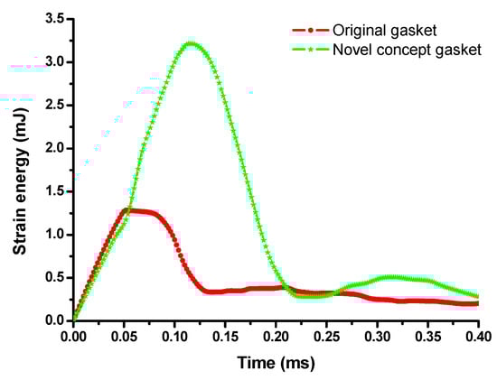 Moreover, the solid regions had more deformation, not only because of their large volume but also more space. Thus, the strain energy of the novel concept gasket was larger than that of the original gasket, as shown in Figure 15. The time in which the maximum strain energy occurred was the same as that of the maximum von Mises stress, which indicated that the armature had the maximum von Mises stress when the gasket could not absorb any strain energy.