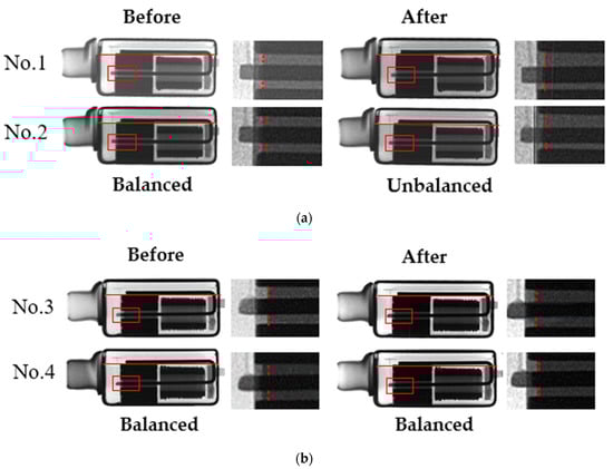 X-ray photos of BA receivers (a) No. 1 and No. 2, and (b) No. 3 and No. 4, before and after the drop impact test.