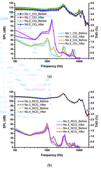 From the figures, on the one hand, the SPLs of No. 1 and No. 2 decreased by 3 dB from 100 Hz to 20 kHz, while No. 3 and No. 4 remained the same without significant differences. On the other hand, the THDs of No. 1 and No. 2 increase by 0.5% from 100 Hz to 20 kHz, while No. 3 and No. 4 did not have significant differences. Hence, samples No. 1 and No. 2 cannot work in good condition after the drop impact test, indicating that the original gasket does not protect the BA receiver sufficiently. However, the SPLs of samples No. 3 and No. 4 verified that the novel concept gasket can protect the BA receiver well. According to the above experiments, the novel concept gasket showed better shock absorption performance.