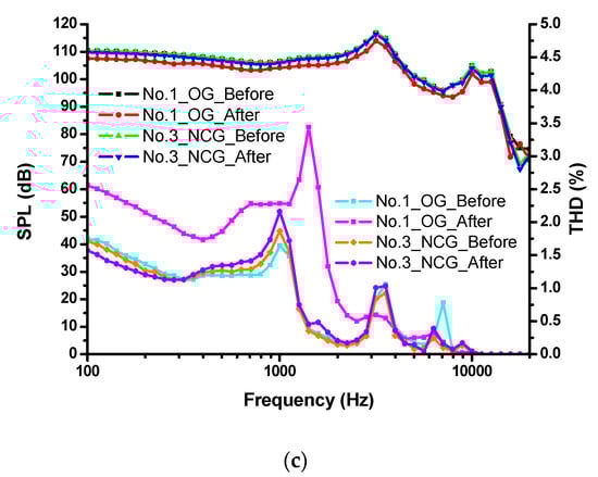 SPLs of BA receivers (a) No. 1 and No. 2, (b) No. 3 and No. 4, and (c) No. 1 and No. 3 before and after the drop impact test.