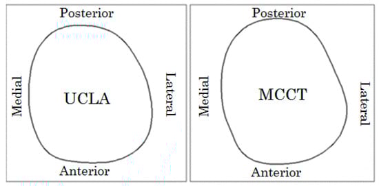 Top cross-sectional views of the sockets constructed based on theUniversity of California Los Angeles (UCLA) and manual casting compression technique (MCCT) types. The different lateral sides toward the anterior direction are clearly distinguished.