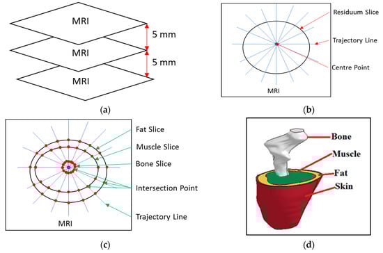 Instead of using a 3D scanner, this study has proposed a low-cost, accurate method where computer-aided design (CAD) Creo software (PTC Ltd., New Delhi, India) has been used to construct the transfemoral residuum and its socket. The utilization of MR images is recommended because its provided distinction between muscle, fat, skin inside the soft tissue image []. Each subject provided 30 MR images which are aligned in the vertical direction with 5 mm spacings between successive images, as shown in Figure 2a. In every image, 36 trajectory lines were drawn from the center point of the residuum slice every 10°, as shown in Figure 2b. Every intersection between each trajectory line and the residuum slice is plotted and connected with a spline curve function using CAD software to generate a cross-section for the image, as shown in Figure 2c. Finally, every cross-section will be combined to construct the 3D model of the residuum shown in Figure 2d. The same procedure will be implemented to create the socket model. The socket model was created using the real size of the prosthetic and not a residuum shape offset as practiced in most previous research studies. The design method has been discussed in detail in Reference [].