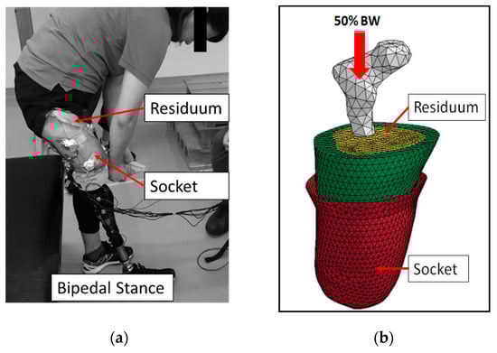 - Zhang, L.; Zhu, M.; Shen, L.; Zheng, F. Finite element analysis of the contact interface between trans-femoral stump and prosthetic socket. In Proceedings of the 2013 35th Annual International Conference of the IEEE Engineering in Medicine and Biology Society (EMBC), Osaka, Japan, 3–7 July 2013; pp. 1270–1273. [Google Scholar]