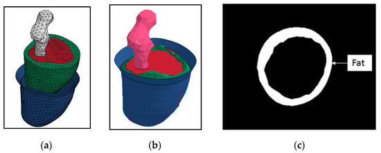 Table 3 showed the list of subjects’ profiles involved in the study. The study focused on the transformation of the geometrical model based on the donning simulation. The result was collected from three parts of the model before and after donning was completed. Figure 5a shows an initial environment for the donning simulation, while Figure 5b shows the simulation result after the donning process is completed. The complete residuum model was then sectioned in 30 cross-sections along the z axis, binary images were generated, as shown in Figure 5c, which shows the fat part of subject A as an example.