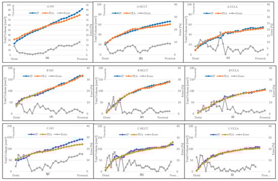 All the part volumes were determined layer-by-layer for each subject, as shown in Figure 6. The results consist of the image processing measurement (IP) and finite element simulation (FEA) outcomes for the three subjects with errors between both measurements. The volume measured before donning is denoted by the NO symbol. The corresponding volumes after the residuum was donned in both the MCCT and UCLA sockets are denoted with the symbols MCCT and UCLA, respectively.