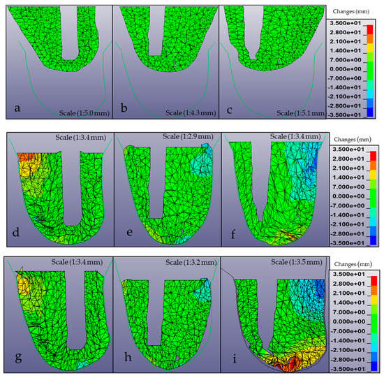 Heat map of a residuum deformation from anterior cross-section view before and after the donning process. (a–c) Residuum models shown before the donning process for subjects (a) A, (b) B and (c) C. (d–f) Results of complete donning into the MCCT socket for subjects (d) A, (e) B and (f) C. (g–i) Corresponding results of the complete donning into the UCLA socket for subjects (g) A, (h) B and (i) C.