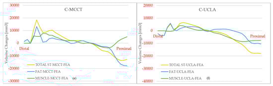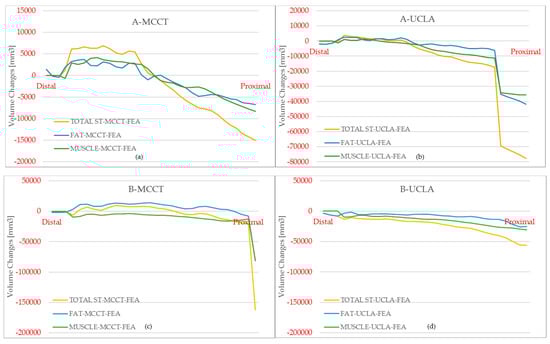 The simulation (FEA) results for subjects A and C indicate that the fat increases in the distal area of the MCCT socket are 18.5% and 23.69%, respectively shown in Figure 8. Additionally, in the distal area of the UCLA socket, the fat respectively increased by 6.63% and 1.68%. However, in the proximal area, the fat respectively decreased by 7.53% and 3.67% in the MCCT socket and by 11.96% and 1.99% in the UCLA socket. Based on the evoked outcomes, we can verify that the fat volume increased in the distal area and decreased in the proximal area of the residuum. The increase of the fat’s volume in the distal area led to the increase of the residuum length.