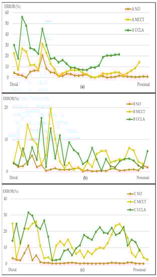 The highest error observed in the distal area of all part models is shown in Figure 10. Specifically, the average errors for the distal areas were respectively equal to 2.88%, 9.33%, 11.92%, 1.04% 13.07%, 13.1%, 1.26%, 12.02% and 20.09%, for subjects A, B and C, without the socket and with the MCCT and UCLA sockets. The error in the proximal area was 32% lower than the average distal area in every model. A significant error was observed in the distal area, most probably because the simulation model was designed from a visually clear, large planar area in the distal end, while the IP measurement was based on the differentiation of a small area which was very precise. In addition, the limitation on the meshing mechanism which was restricted to 20,000 units elements also affected the volume measurement in the FEA model. Furthermore, the boundary condition in the simulation reflected the result whereby most of the body weights of the subjects were located at the top parts of the residuum at which the force was not well distributed within the distal area because the soft tissue material had a high elasticity and density. As a result, the deformation in the distal area was not significant compared to the deformation in the proximal area.