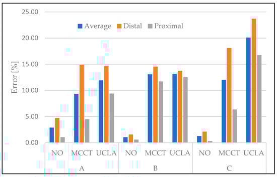 Comparisons of average errors of IP–FEA for every tested model within the average, distal and proximal areas.