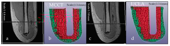 The study involved three subjects. The main criteria of the selected subjects are that they must have a single above knee (transfemoral) amputated leg. All selected subjects have more than 5 years of experience wearing the prosthetic socket. The subjects are a volunteer and have no conflict of interest in the research. The magnetic resonant (MR) images for the subjects were obtained using a Siemens Magneton Symphony Maestro class 1.5 T. The MR image was chosen owing to its ability to generate excellent soft-tissue contrast and to differentiate soft tissues and muscle boundaries [,]. In Reference [], MR image also has been used to create the resemblance of residuum model. However, the created model only utilized the outer area of the residuum cross section image. Residuum model created in the study is categorized into 3 main parts namely fat, muscle and bone. The adipose tissue part is assumedly merged with the fat part because of the similarities of their mechanical properties. Two Ischial–Ramal–Containment (IRC) socket types—namely UCLA and MCCT—were used in this study. The IRC–UCLA socket is a standardized transfemoral prosthetic socket that is extensively used, while the IRC–MCCT is a socket introduced by Professor Yukio Agarie in Japan. The socket was inspired and created based on the standard IRC socket. The difference between the two sockets is that the stability of the IRC–MCCT socket was improved by the adjustment of the anterolateral and sagittal directions of the IRC–UCLA socket [], as shown in Figure 1 and the method used to produce the IRC–MCCT socket uses MCCT.