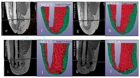 Graphical comparison of FEA model and MRI during complete donning. (a,c) MR images of the residuum for subject A in the (a) MCCT and (c) UCLA sockets. (b,d) FEA simulation results for subject A after the completion of donning inside the (b) MCCT and (d) UCLA socket. (e,g) MR images for the residuum of subject B in the (e) MCCT and (g) UCLA sockets. (f,h) FEA simulation results of subject B after the completion of donning inside the (f) MCCT and (h) UCLA sockets. (i,k) MR images for the residuum of subject C in the (i) MCCT and (k) UCLA socket. (j,l) FEA simulation results of subject C after the completion of donning inside the (j) MCCT and (l) UCLA sockets.
