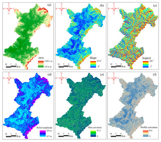 Topography factors in Shicheng County: (a) DEM, (b) Slope, (c) Aspect, (d) Relief amplitude, (e) Plan curvature, (f) Profile curvature.