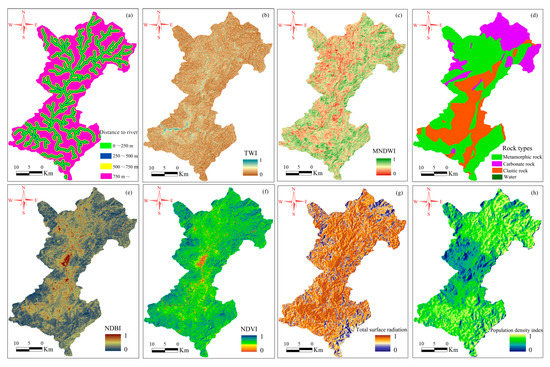 Hydrological, lithological, and land cover factors in Shicheng County, (a) Distance to river, (b) TWI, (c) MNDWI, (d) Rock types, (e) NDBI, (f) NDVI, (g) Total surface radiation, (h) Population density index.